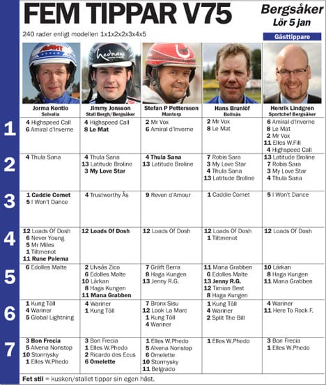 Fem tippar V75 – Bergsåker 5 januari