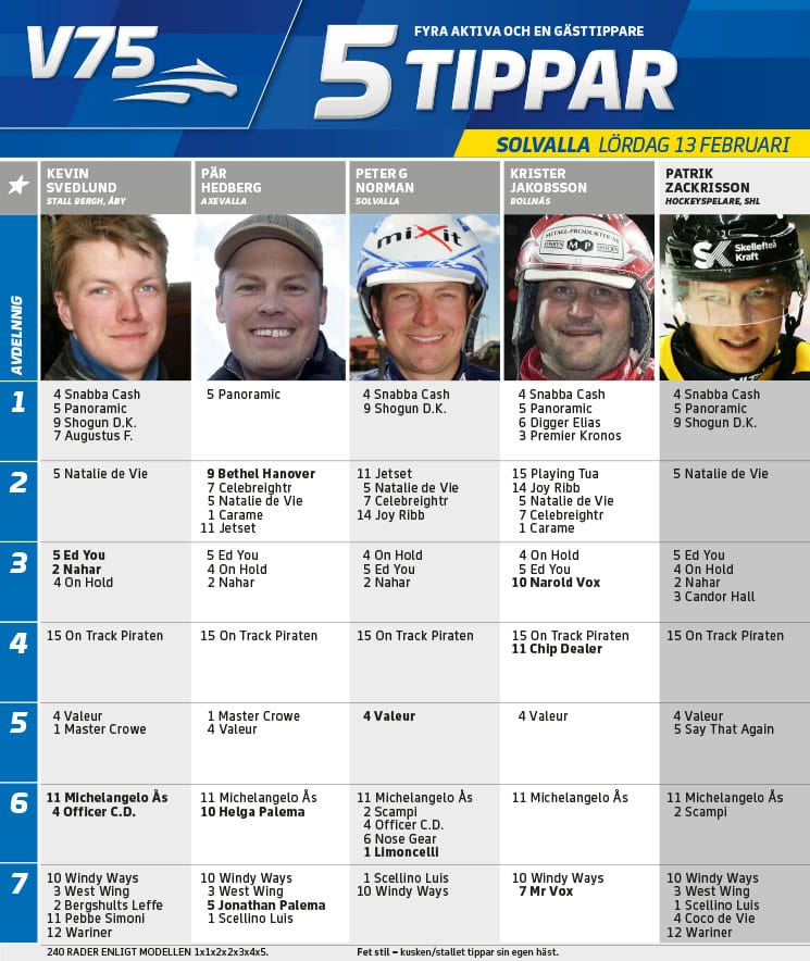 Fem tippar V75 till Solvalla 13 februari 8 februari, 2016130LADDA NER SOM PDF HÄR:fem-tippar-v75-160213-520180STUDERA STARTLISTORNA HÄR:http://www.alltomtrav.info/atg/v75-startlistor/
